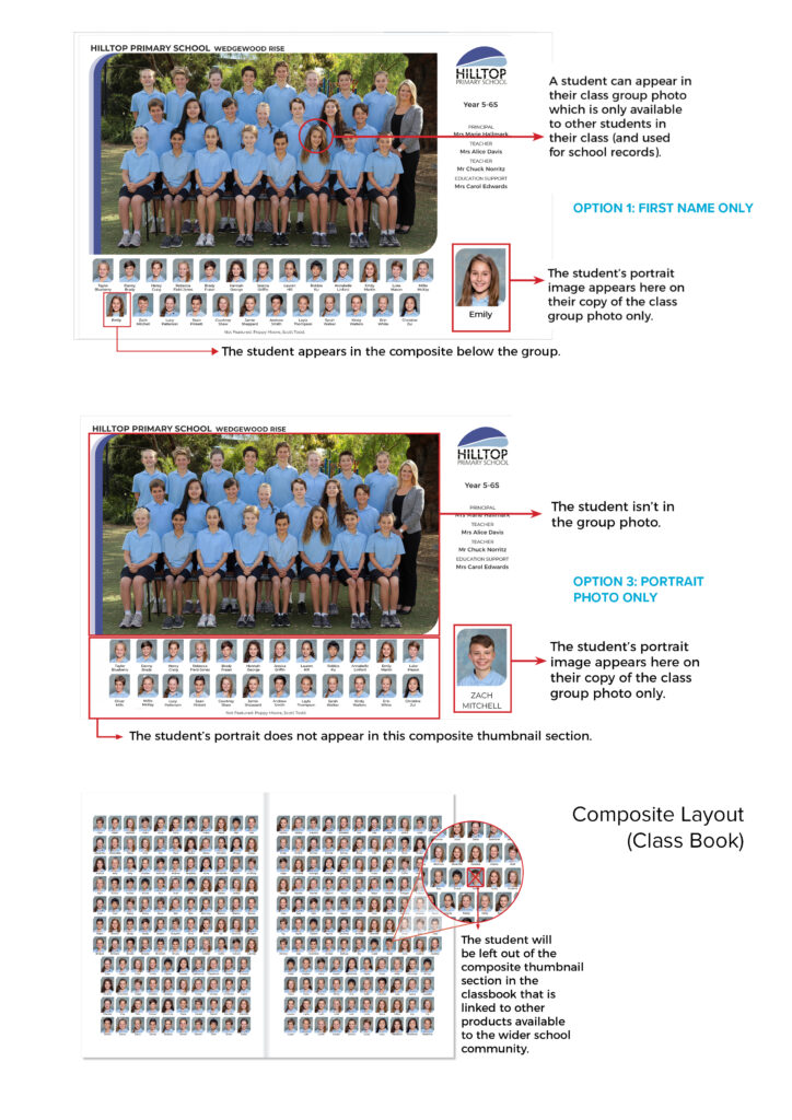 To ensure that the privacy of these students is maintained, their names should not be included in the class list. The school is responsible for ensuring that these students do not present for photos, including class, whole school, or miscellaneous group photos. If a protected student presents for a photo, our photographers will take their photo, assuming they are not on our lists because they are a new student. In such a case, the group photo must be retaken, and SchoolPix will not be held responsible for any costs incurred.