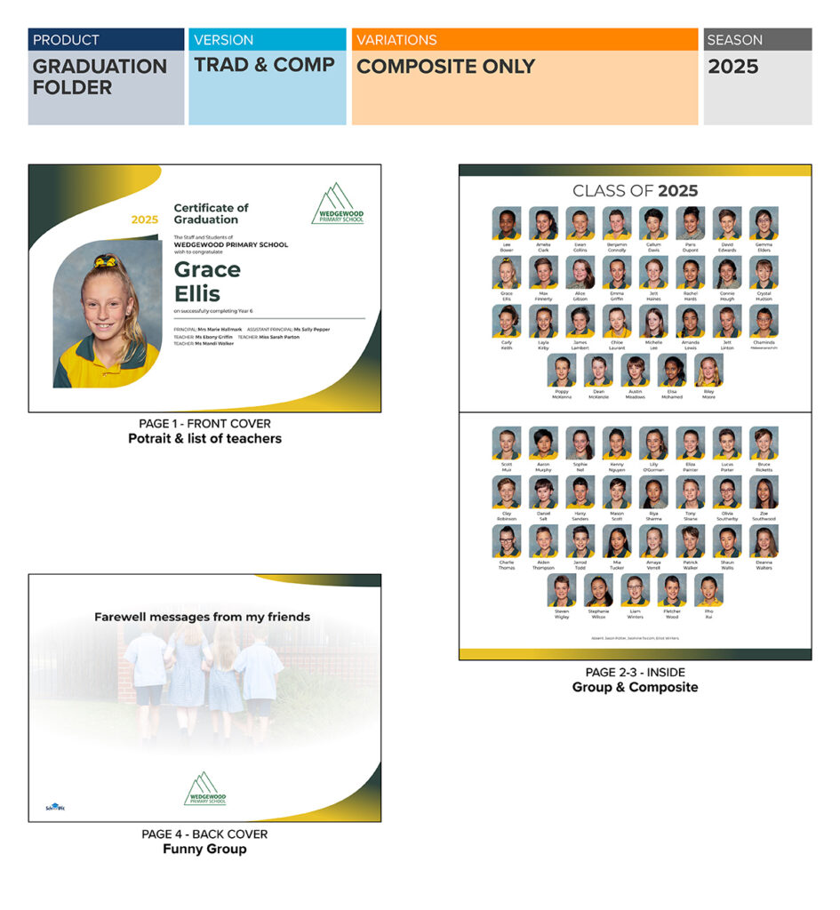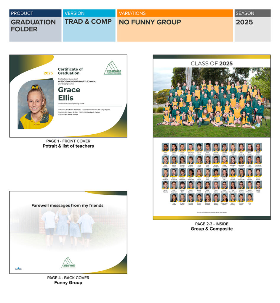 We offer each year 6 and year 12 student a complimentary Graduation Folder. We have a standard template design that includes a funny group photo as per below. Scroll down for further options.