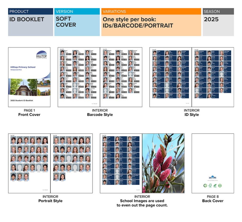 Our soft-cover ID Booklet is a perfect reference tool for effortlessly identifying every student! Whether you’re in the library scanning barcodes for each student, browsing through a portrait section with names or using the ID style, these booklets are a convenient and invaluable resource to keep within arm’s reach around the school.