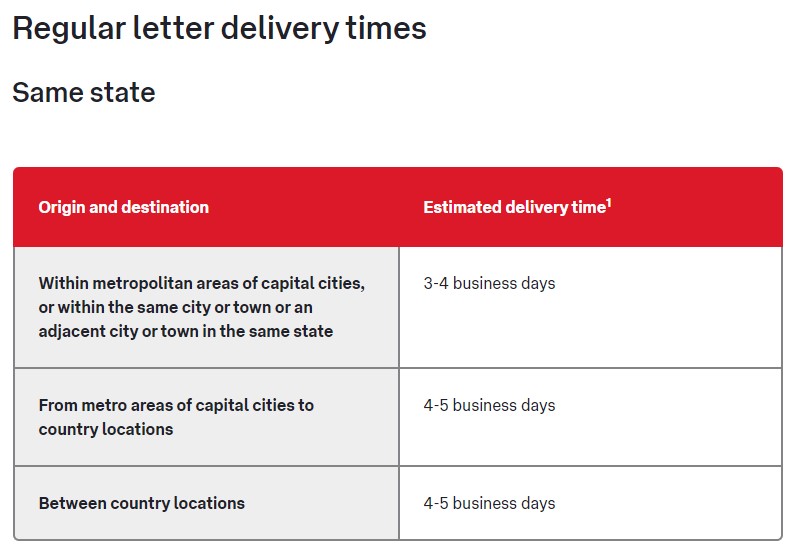Since April 15, 2024, Australia Post has changed its estimated delivery timeframes for regular and priority letters. Please note that letters may be delivered earlier than the timeframes shown on their website as they make progressive delivery model changes across the country through to the end of 2025.
