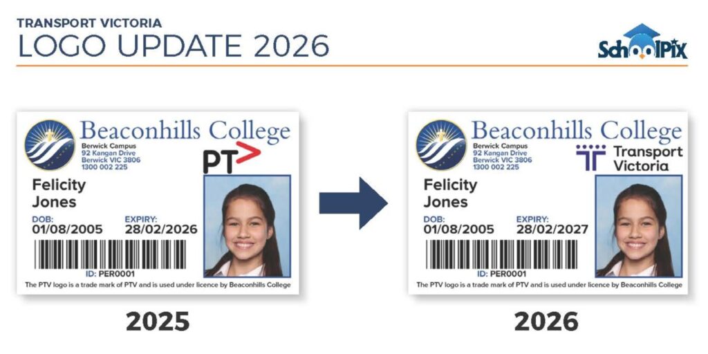 During the transition period, Student ID Cards that have either the PTV logo or the Transport Victoria logo will both be accepted as correct concession identification. Schools will receive notification from Transport Victoria when their current agreement to use the PTV logo is due to expire, prompting them to switch to the Transport Victoria logo instead.