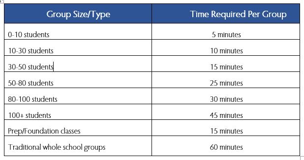 Please allow enough time for photography for each class based on size. The table below outlines the amount of time required for each group.