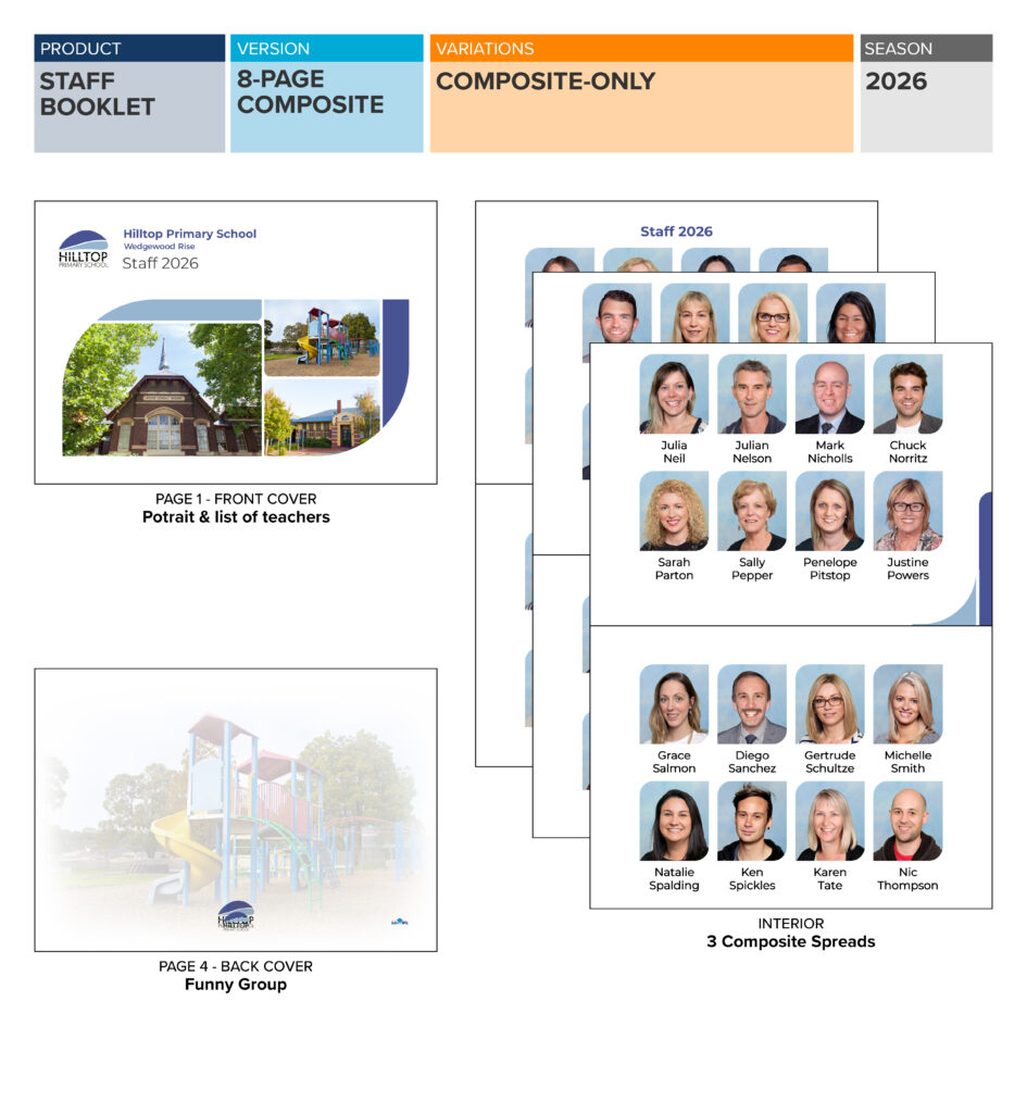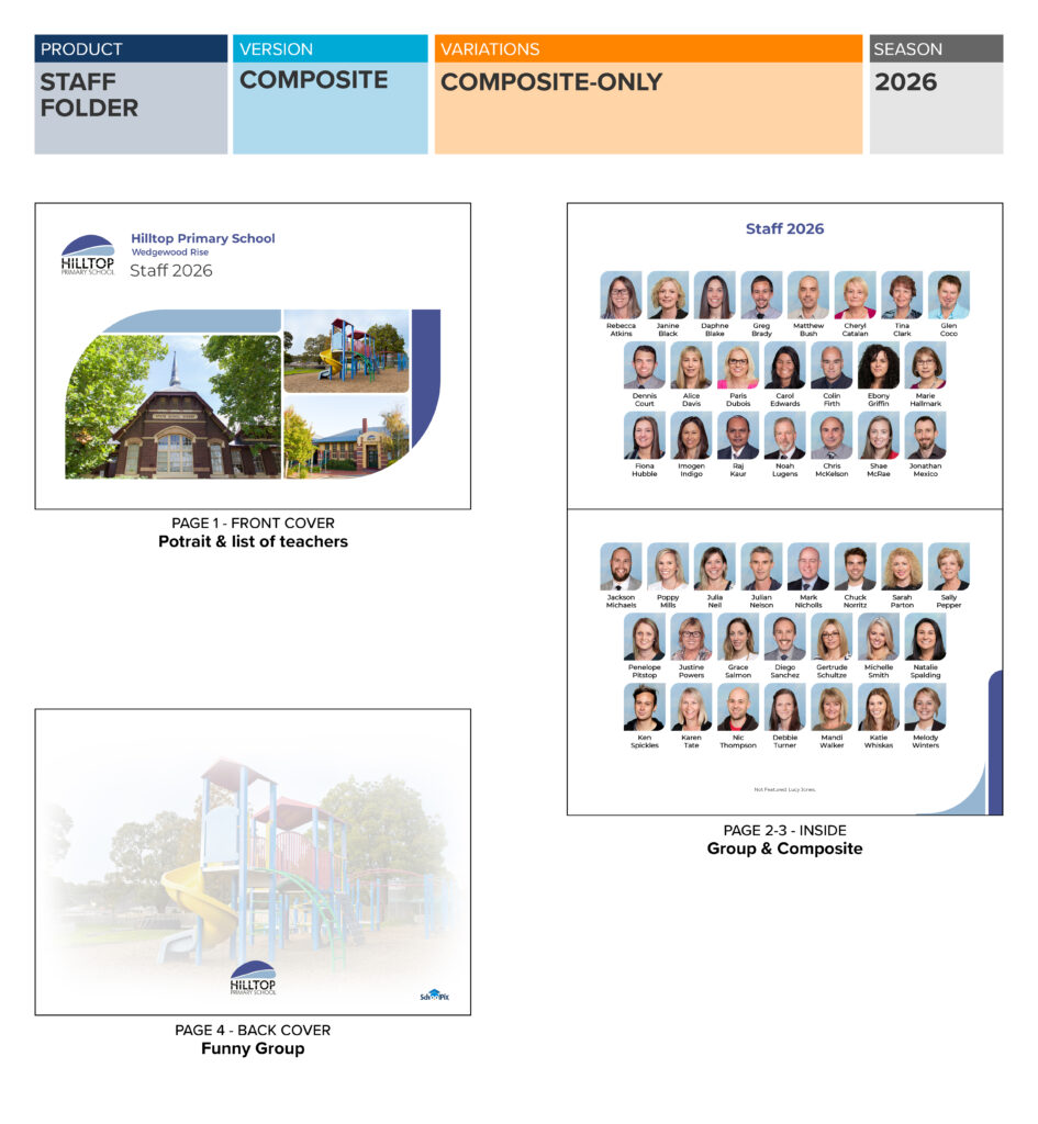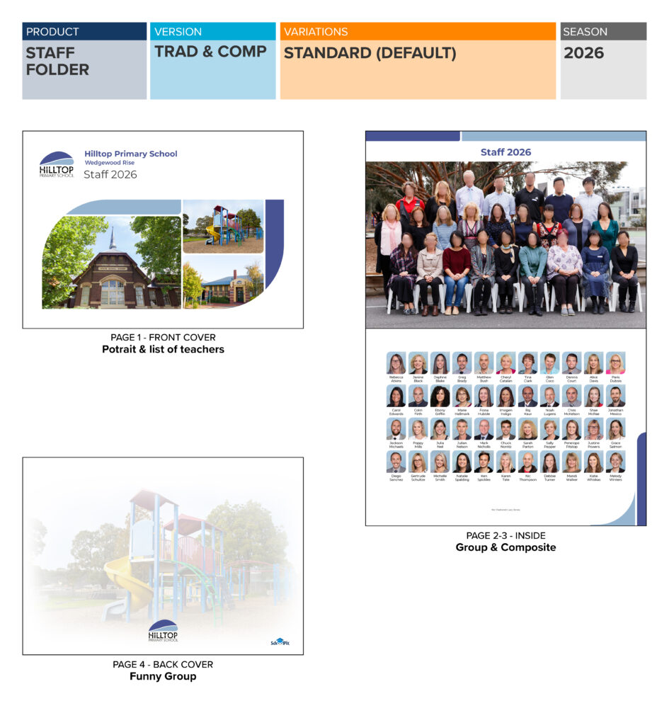 SchoolPix also offers an A4 staff folder as an upgrade option (it replaces the staff group photo) for just $1.65 per person. A folder can be added to the staff package for $7.45 per person.