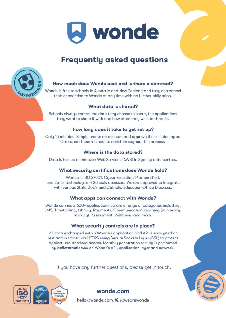 If you would like to connect with Wonde to make data sharing secure and easy, contact them at support@wonde.com or 1800 064 506. Remember to let them know that you’re a SchoolPix customer!